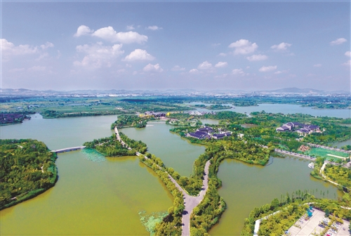 7月18日,航拍下的賈汪區(qū)潘安湖濕地公園,在藍(lán)天白云的映襯下,構(gòu)成一幅美麗的畫(huà)卷。