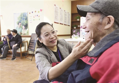 李梅至今難忘,剛?cè)胄胁痪,一位老人在院里去世,年輕的她手足無措,六神無主。此時旁邊一位老人說:“遇到這種事不要急,慢慢來。”短短的一句話溫暖了她,以后再遇到更大的困難,她都能夠從容應(yīng)對。“幫老人喂飯、翻身拉家常,也是靠近他們的機會,可以營造一個大家庭的溫馨。”機構(gòu)里有一位坐在輪椅上的失智老人,或許由于病情的原因,他見誰都沒有笑臉,可是遠遠地看見李梅,就像見到喜歡的閨女,很是開心自豪。