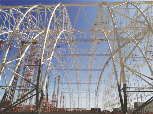 跨度229米的方家莊電廠封閉煤場施工現(xiàn)場。