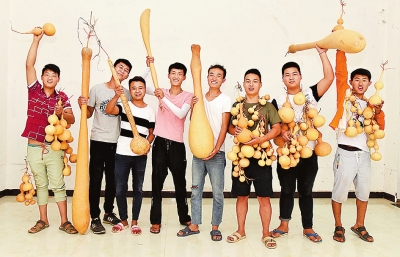 宜陽縣張塢鎮(zhèn)元過村小伙兒車高航(右四)大學畢業(yè)后,帶領同伴返鄉(xiāng)創(chuàng)業(yè),鉆研葫蘆種植,并將種植規(guī)模擴大到了80余畝,成立了合作社。 |