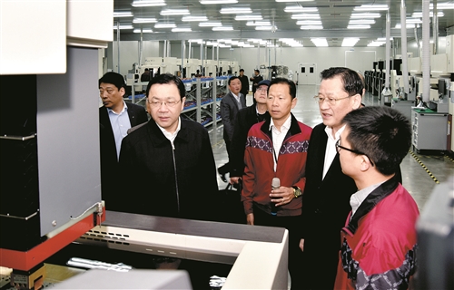 省委常委、統(tǒng)戰(zhàn)部部長(zhǎng)楊岳(左二)在市委常委、經(jīng)開區(qū)黨工委書記王強(qiáng)(右二)陪同下調(diào)研臺(tái)灣正崴高端電子與電機(jī)項(xiàng)目。