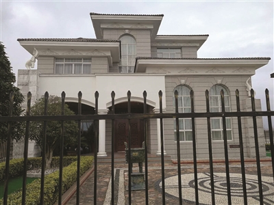 束昱輝家的老宅占地寬約30米,長約50米,與周圍鄰居的房子比起來特別顯眼,周圍都用鐵柵欄圍著。三層小樓是灰色的歐式建筑,房子兩側(cè)還有兩個小象的雕塑。院子里有涼亭、香爐、小池塘和健身器材,整個院子都用大理石和鵝卵石鋪上了。