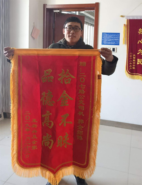 市公交公司:1月22日下午,乘客王先生為公交公司送來(lái)一面錦旗。原來(lái)他乘坐207路公交車(chē)時(shí),不慎將裝有7000多元現(xiàn)金、鉆戒、駕駛證以及各種銀行卡的背包落在車(chē)上,還好駕駛員郭全發(fā)現(xiàn)后,立即交到車(chē)隊(duì)。當(dāng)王先生意識(shí)到背包丟失后,非常著急。幸運(yùn)的是,不久他接到了車(chē)隊(duì)打來(lái)的電話,告訴他背包已經(jīng)被拾到,讓他盡快取回。背包失而復(fù)得,王先生非常高興,他特意送來(lái)錦旗,以示感謝。