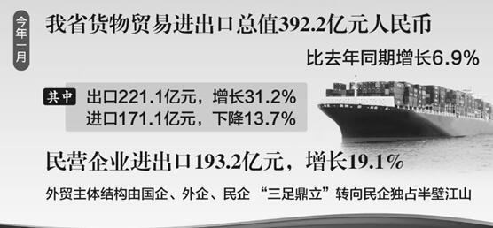 在去年1月外貿(mào)值創(chuàng)歷史開年新高的基礎(chǔ)上,今年1月,我省貨物貿(mào)易進(jìn)出口總值392.2億元人民幣,直逼400億元大關(guān),比去年同期增長6.9%。其中,出口221.1億元,增長31.2%;進(jìn)口171.1億元,下降13.7%。