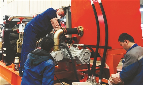 3月14日,位于徐州經(jīng)開區(qū)的徐州景安重工車間里,工人們正圍著一臺橘色機器進行液壓系統(tǒng)的組裝。