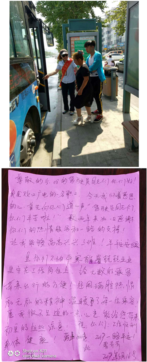 信中這樣寫(xiě)道:“我們是廣電局歡口廣電的職工,長(zhǎng)年乘坐從豐縣到歡口的208、215路公交車(chē),被該車(chē)組的熱情服務(wù)所感動(dòng),對(duì)乘客勝似親人,態(tài)度熱情,工作認(rèn)真,就像是對(duì)自己的家人一樣關(guān)愛(ài)有加......”
