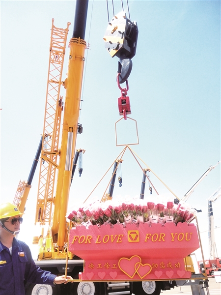 工作人員手持ipad輕松操控XCA60E吊起花籃。