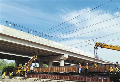 3月底,徐賈快速通道跨隴海鐵路橋架到了12跨。6月13日,記者再去探班,這座23跨的大橋箱梁已全部架設(shè)完成,工人們有的正在橋面上鋪裝混凝土,有的正在拆除架橋機(jī)。