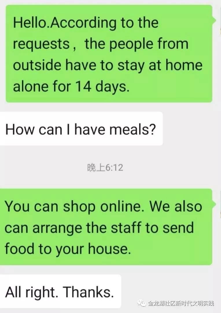 近日,徐州經(jīng)開區(qū)企業(yè)迎來(lái)復(fù)工潮。居住在金龍湖街道金龍湖社區(qū)的某外企高管白瑞克(化名),從歐洲返回徐州后,因疫情特殊時(shí)期,開啟了14天的“居家辦公”模式。了解情況后,金龍湖社區(qū)居委會(huì)第一時(shí)間通過(guò)電話、微信等方式與白瑞克及翻譯溝通交流,及時(shí)準(zhǔn)確向白瑞克傳遞徐州新冠肺炎疫情阻擊戰(zhàn)相關(guān)信息,消除外籍人員因信息缺失或謠言帶來(lái)的恐慌,主動(dòng)幫助其加強(qiáng)自我防護(hù)、接受防疫資訊。同時(shí),社區(qū)工作人員對(duì)白瑞克“居家辦公”的生活問(wèn)題提供多種解決方案,并主動(dòng)提出“送菜上門”服務(wù),全力保障外籍人員日常生活所需,得到了白瑞克的認(rèn)可,他特地給社區(qū)工作人員回復(fù)微信:“All Right .Thanks .”