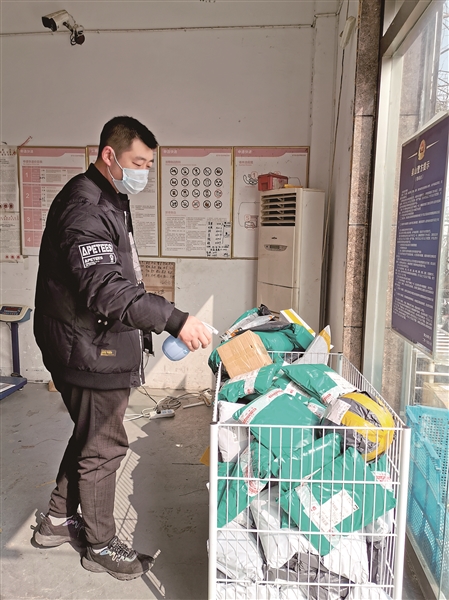 申通快遞李鶴在給網(wǎng)點(diǎn)的快遞件消毒。