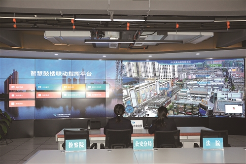 上圖 在鼓樓區(qū)數(shù)字產(chǎn)業(yè)園,江蘇微雀信息科技有限公司開發(fā)的疫情防控信息化平臺、企業(yè)復(fù)工可視化平臺前,網(wǎng)格員正在監(jiān)控轄區(qū)疫情防控和復(fù)工復(fù)產(chǎn)情況。