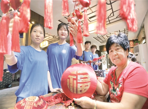 七月十八日上午,南京部分高校的大學(xué)生到賈汪馬莊村旅游購物。香包不僅成為馬莊的品牌,還帶動當(dāng)?shù)卮迕窬蜆I(yè)致富。