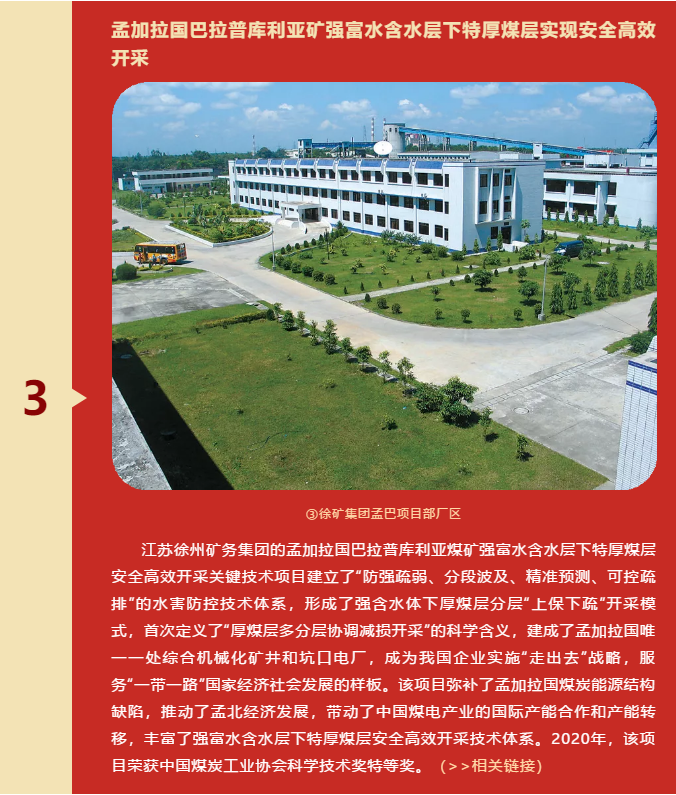 徐礦集團的《孟加拉國巴拉普庫利亞煤礦強富水含水層下特厚煤層安全高效開采關(guān)鍵技術(shù)》項目建立了“防強疏弱、分段波及、精準預(yù)測、可控疏排”的水害防控技術(shù)體系,形成了強含水體下厚煤層分層“上保下疏”開采模式,首次定義了“厚煤層多分層協(xié)調(diào)減損開采”的科學(xué)含義,建成了孟加拉國唯一一處綜合機械化礦井,成為我國企業(yè)實施“走出去”戰(zhàn)略,服務(wù)“一帶一路”國家經(jīng)濟社會發(fā)展的樣板。