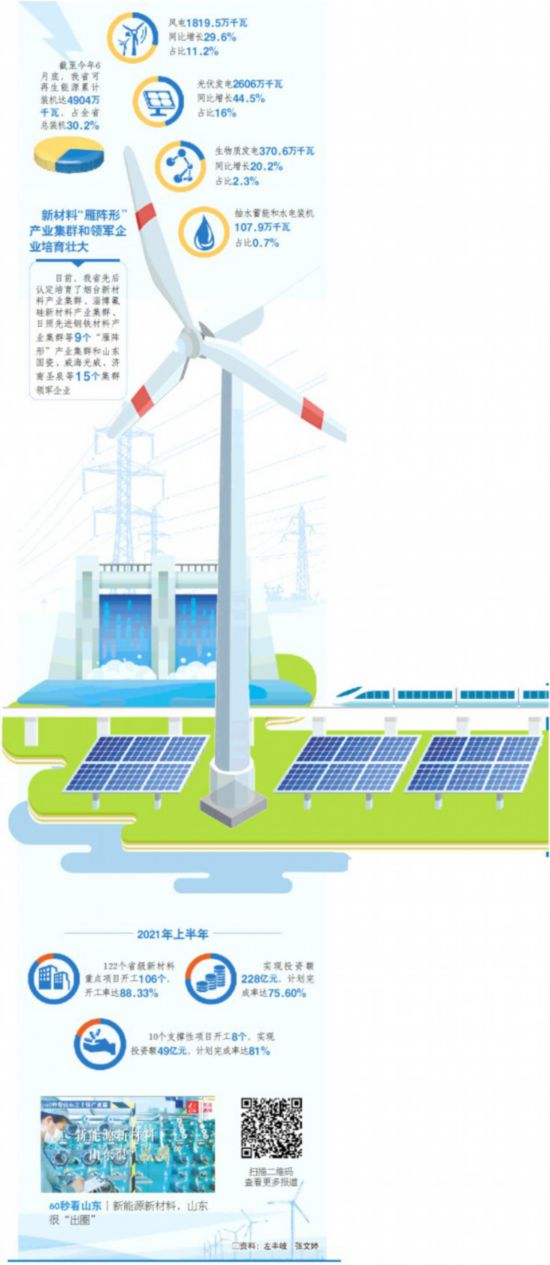新能源不斷賦能,山東能源結(jié)構(gòu)綠色轉(zhuǎn)型成效顯著。截至今年6月底,全省可再生能源裝機(jī)達(dá)到4903.9萬(wàn)千瓦,同比增長(zhǎng)35.4%,占電力總裝機(jī)的30.2%。山東將繼續(xù)聚焦“雙碳”目標(biāo)任務(wù),加快實(shí)施可再生能源替代行動(dòng),力爭(zhēng)“十四五”期間,全省可再生能源發(fā)電裝機(jī)達(dá)到9000萬(wàn)千瓦左右,讓全省能源結(jié)構(gòu)透出更多綠意、釋放更多新動(dòng)能。