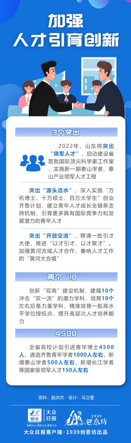 2月7日,山東省2022年工作動(dòng)員大會(huì)提出當(dāng)前和今后一個(gè)時(shí)期要重點(diǎn)抓好“十大創(chuàng)新”,其中第二項(xiàng)就是“加強(qiáng)人才引育創(chuàng)新”,明確要在招才引智上出新招,突出領(lǐng)軍人才、“源頭活水”、開(kāi)放交流;在自主培養(yǎng)上出新招,用好高校、職教兩個(gè)陣地;在人盡其才上出新招,給各類人才信任、機(jī)會(huì)、激勵(lì)和舞臺(tái)。
