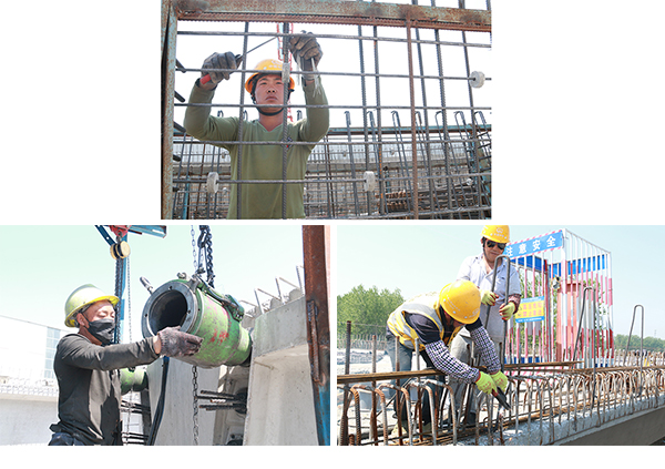 在路基施工現(xiàn)場,機器的轟鳴聲,穿梭于兩側的麥田之間不絕于耳,一陣又一陣好使勝利的號角。在橋面系施工現(xiàn)場,產(chǎn)業(yè)工人們忙碌的進行著梁面橫向濕接縫連接,牽絆穿梭于梁端之間的立錐之地進行橫隔板模板安裝,相互配合量尺拉線安裝調(diào)整防撞護欄鋼筋就位,用他們黝黑的皮膚,粗糙的雙手,堅毅的目光,不懈的勞作,迎接第143個勞動節(jié)的到來。