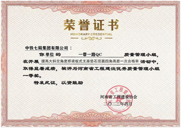 黃淮網(wǎng)(董成 李勇) 近日,在河南省工程建設(shè)協(xié)會2022年度QC成果發(fā)布會上,中鐵七局三公司連宿高速4標項目“一帶一路”QC小組成果《提高大斜交角度橋梁板式支座墊石頂面四角高差一次合格率》成果再獲佳績,獲得河南省工程建設(shè)QC小組一等獎。該課題發(fā)布人柴榮太獲得最佳發(fā)布制作獎。另悉,該QC成果已被推選至中國施工企業(yè)管理協(xié)會,參加國家級申報評選。