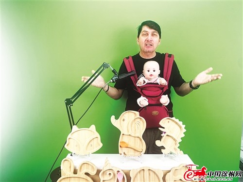 走進(jìn)其中的兒童竹餐盤直播間,簡單的綠幕前,胸前坐抱著一個仿真嬰兒的南非實習(xí)主播維森特一副 “奶爸”模樣,一邊“哄逗”嬰兒,一邊用英文認(rèn)真地介紹著眼前各種造型的兒童竹餐盤。