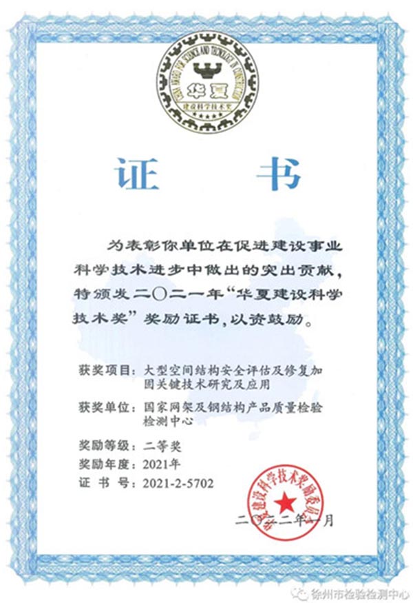 今年初,該中心聯(lián)合徐州工程學院等單位共同承擔完成的“大型空間結(jié)構(gòu)安全評估及修復加固關(guān)鍵技術(shù)研究及應用”項目成果獲華夏建設(shè)科學技術(shù)獎二等獎,充分彰顯了在大型空間結(jié)構(gòu)檢驗檢測領(lǐng)域的行業(yè)領(lǐng)先地位。其中, 空間結(jié)構(gòu)強度無損檢測、空間結(jié)構(gòu)損傷識別指標、空間結(jié)構(gòu)安全評估、加固及修復技術(shù)達到國際領(lǐng)先水平,獲國家授權(quán)專利16件(其中發(fā)明專利3件),部分成果已納入4項國家標準。該項目成果直接應用于國家會展中心、援科特迪瓦阿比讓體育場項目等20 余座世界級特大跨度空間結(jié)構(gòu)工程,獲中國建設(shè)工程魯班獎 2 項、中國鋼結(jié)構(gòu)金獎3項、建筑長城杯金質(zhì)獎1項,極大提升了大型空間結(jié)構(gòu)安全與防護行業(yè)的科技進步。
