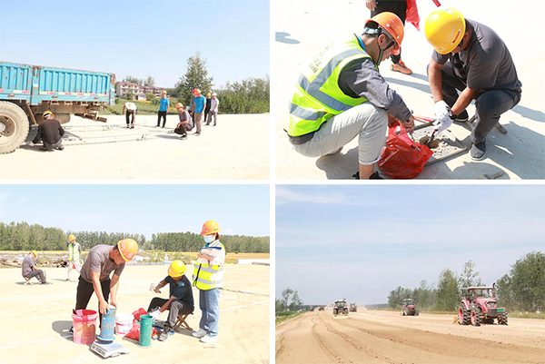為加快項(xiàng)目路床全段順利交驗(yàn),項(xiàng)目部統(tǒng)一協(xié)調(diào),加大施工組織力度,見(jiàn)縫插針加快路床96區(qū)施工,增加設(shè)備搶抓大好天氣,先后投入渣土車46臺(tái)、壓路機(jī)9臺(tái)、平地機(jī)2臺(tái)、灑水車2臺(tái),分段組織集中上土整平碾壓;各區(qū)技術(shù)、安全、質(zhì)檢人員全程跟班,確保填筑里程高程、橫縱坡度比例、碾壓密度實(shí)度以及彎沉測(cè)試等各項(xiàng)指標(biāo)滿足設(shè)計(jì)規(guī)范和施工要求;同時(shí),確保路基施工安全質(zhì)量可控。