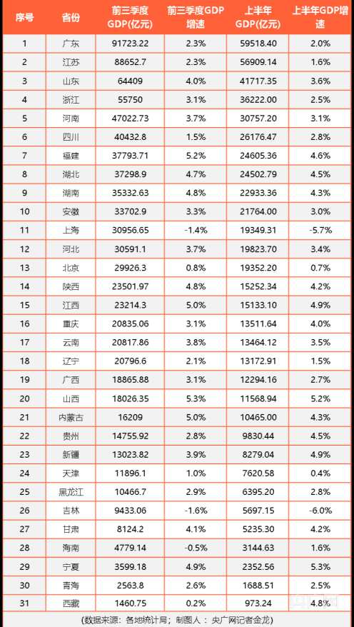 11月2日,陜西統(tǒng)計局發(fā)布數(shù)據(jù)顯示,前三季度全省實現(xiàn)地區(qū)生產(chǎn)總值23501.97億元,按可比價格計算,同比增長4.8%。至此,全國已經(jīng)有31個省市發(fā)布了前三季度地區(qū)生產(chǎn)總值(GDP)增長情況,其中廣東經(jīng)濟總量達91723.22億元,繼續(xù)穩(wěn)居全國第一,江蘇、山東分別位列第二名和第三名。