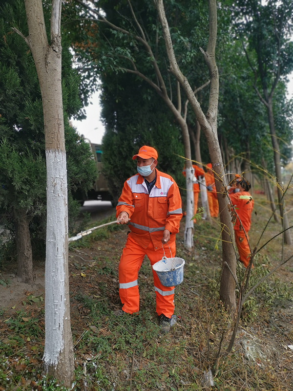 樹(shù)木刷白是冬季樹(shù)木養(yǎng)護(hù)管理的一項(xiàng)重要內(nèi)容,一是可以反射陽(yáng)光,在冬季能降低樹(shù)干晝夜溫差的作用,從而減輕凍害、日灼等對(duì)樹(shù)體的傷害;二是利用這層膜覆蓋樹(shù)干,阻隔病菌和害蟲(chóng)侵入樹(shù)體,阻止成蟲(chóng)產(chǎn)卵和減少害蟲(chóng)潛伏入冬。