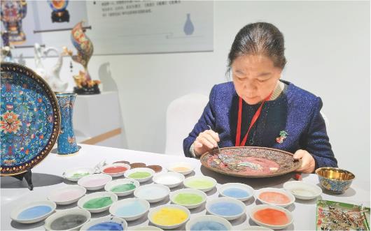 2月18日,運(yùn)河沿線城市手造展上,非物質(zhì)文化遺產(chǎn)國家級項目景泰藍(lán)技藝傳承人李佩卿正在現(xiàn)場創(chuàng)作。(張雙雙 賀瑩瑩 報道)