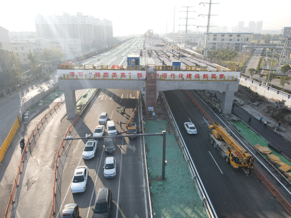 九里湖立交是徐豐公路快速化改造工程首個開工建設的先導標段,為穿跨越龐莊華美熱電公司專用鐵路線節(jié)點工程,南起樁號K3+015,穿跨越鐵路后,終點樁號為K3+663,全長648m,工程合同金額3.1億元。建成后的下穿通道斷面寬度為52米,其中機動車道為雙向六車道,設計時速80公里/小時;非機動車箱涵兩個,分別為4米慢車道加3米人行道。該先導標工程正在實施的還有上跨高架橋快速路主體工程,設計斷面為雙向六車道,目前橋梁箱涵已架設完畢,正在組織橋面濕接縫和橋面鋪裝施工。