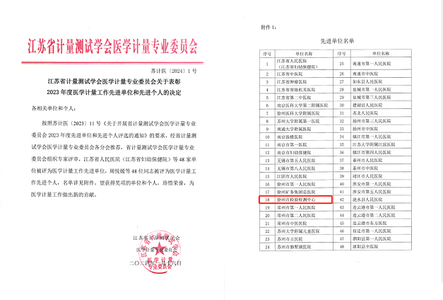 徐州市檢驗檢測中心喜獲“2023年度江蘇省醫(yī)學(xué)計量工作先進單位”榮譽稱號