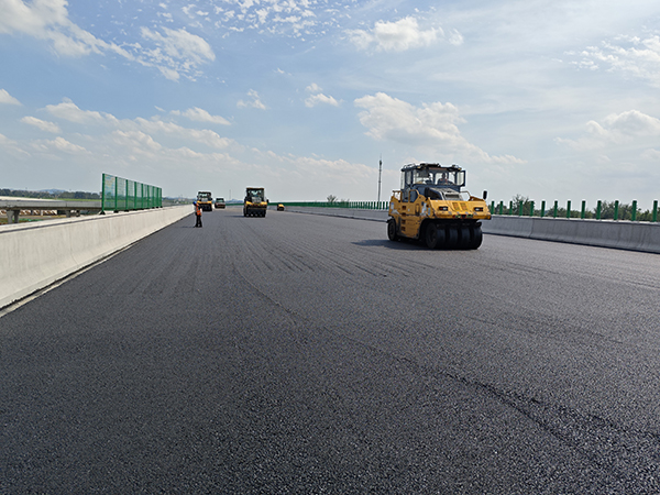 在整個瀝青面層施工過程中,項目部嚴格按照施工方案及相關技術規(guī)范,在運輸、攤鋪、碾壓等環(huán)節(jié)中嚴格落實各項施工工藝和技術措施,并在施工中實時監(jiān)測瀝青溫度、攤鋪厚度、平整度等關鍵性指標,不斷總結經(jīng)驗,確保瀝青攤鋪施工質量。尤其是進入路面上面層SMA-13S施工以來,項目部搶抓施工黃金季節(jié),不等不靠、科學謀劃,克服了工期緊、任務重、施工階段性多等難題,項目管理團隊協(xié)調聯(lián)動、強力推進,狠抓安全質量,提高工作效率,全力沖刺完成瀝青路面施工任務。