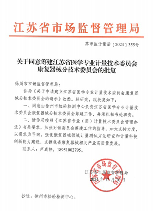 黃淮網(孫楊) 近日,江蘇省市場監(jiān)督管理局正式下達批復,同意由徐州市檢驗檢測中心負責籌建江蘇省醫(yī)學專業(yè)計量技術委員會康復器械分技術委員會(以下簡稱“分技術委員會”),并承擔秘書處職責。