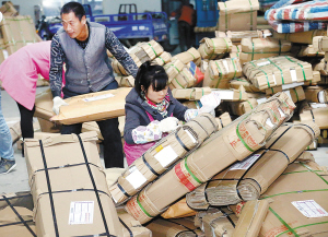 11月9日下午4時20分,一輛輛載重10多噸的快遞車輛在東風(fēng)村物流園集聚。一邊填寫快遞單、一邊幫忙上貨的圓通速遞營業(yè)員王慧說:“這幾天網(wǎng)商們發(fā)件量急增,每天都在1500至2000件,為了備戰(zhàn)‘雙十一’,我們也調(diào)整了戰(zhàn)略,每隔一至兩個小時就上門收貨一次,營業(yè)部還增加了10名快遞員和兩輛快遞車,以確保網(wǎng)購沙集商品的消費(fèi)者在第一時間能收到貨。”