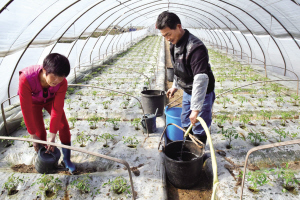 正月初三,丹徒區(qū)谷陽鎮(zhèn)番茄生產(chǎn)基地內(nèi)糜云夫婦在田間為番茄苗補(bǔ)水。隨著氣溫回暖,過冬蔬菜進(jìn)入生長期,菜農(nóng)們紛紛走進(jìn)大棚,對(duì)蔬菜加強(qiáng)田間管理。張斌 江羅瑞 攝影報(bào)道