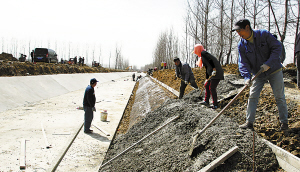 3月28日,記者來(lái)到邵店鎮(zhèn)朱圩村,新建的朱圩干渠正在緊張地施工中,幾名工人正在澆筑干渠護(hù)坡。現(xiàn)場(chǎng)一位工程負(fù)責(zé)人說(shuō),這條干渠是2015年第二批工程項(xiàng)目,總長(zhǎng)度860米,上口寬8米,深1.6米,總投資50萬(wàn)元左右。工程于去年11月開工,今年5月底竣工。