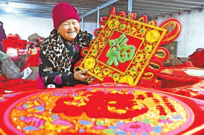 1月8日,夏邑縣火店鎮(zhèn)集家村手工藝品加工廠內(nèi),一位村民展示中國結(jié)。近期該工廠工人加緊趕制中國結(jié),以供應(yīng)節(jié)日市場。該鎮(zhèn)大力發(fā)展手工藝品加工產(chǎn)業(yè),讓農(nóng)民實(shí)現(xiàn)了在家門口脫貧致富。⑨3苗育才攝