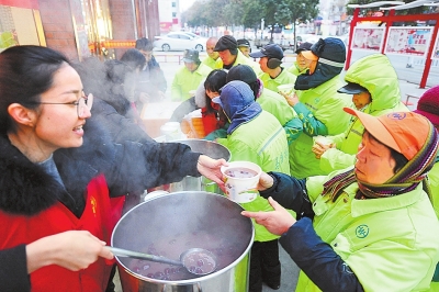 “這粥特別好喝,熬得很透,喝下去暖暖的。一大早,我們就能喝上好心人送來(lái)的臘八粥,高興著哩!”1月13日,環(huán)衛(wèi)工人祁富民一邊喝著粥,一邊贊不絕口。