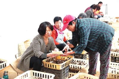 清豐縣馬莊橋鎮(zhèn)趙家莊村民在食用菌基地分揀雞樅菌。 |
