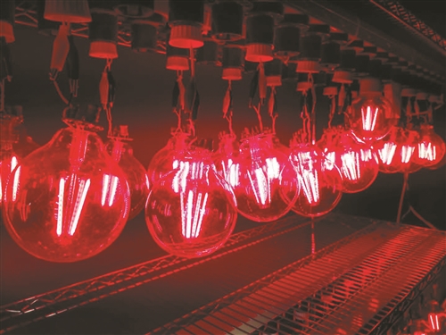 研發(fā)中的植物生長(zhǎng)燈則擁有單獨(dú)的實(shí)驗(yàn)室。實(shí)驗(yàn)室猶如一間暗房,四周密不透光,推門而入,是一片紅色世界,燈架上,幾十盞燈具正散發(fā)著溫柔的紅光。