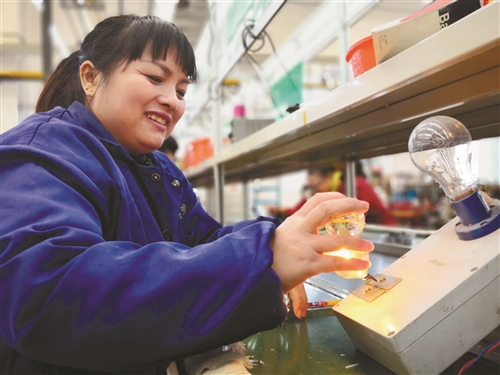 車間里,加工線上,工人們正在機(jī)器旁嫻熟地加工著各類燈具;老化線上,剛下線的燈具正一個(gè)個(gè)被通電點(diǎn)亮,40分鐘后,沒有閃光、過(guò)熱等異常,燈泡符合出廠條件。