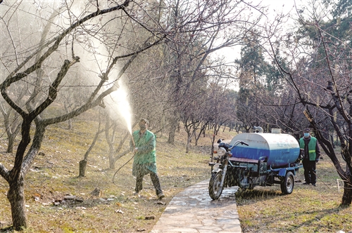 園林工人給景觀樹木澆水。 通訊員 鄭舟 攝