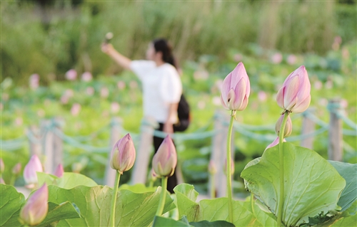 7月6日,在銅山區(qū)柳泉鎮(zhèn)北村萬荷園里,荷花或含苞待放,或盡情綻放,清風(fēng)徐來,荷香陣陣。站在觀荷亭眺望,三面青山、一片碧湖,粉墻黛瓦的古老村落沿著山勢錯落而上……一幅美麗的鄉(xiāng)村畫卷讓人心曠神怡。 徐報融媒記者 孫井賢 攝 |