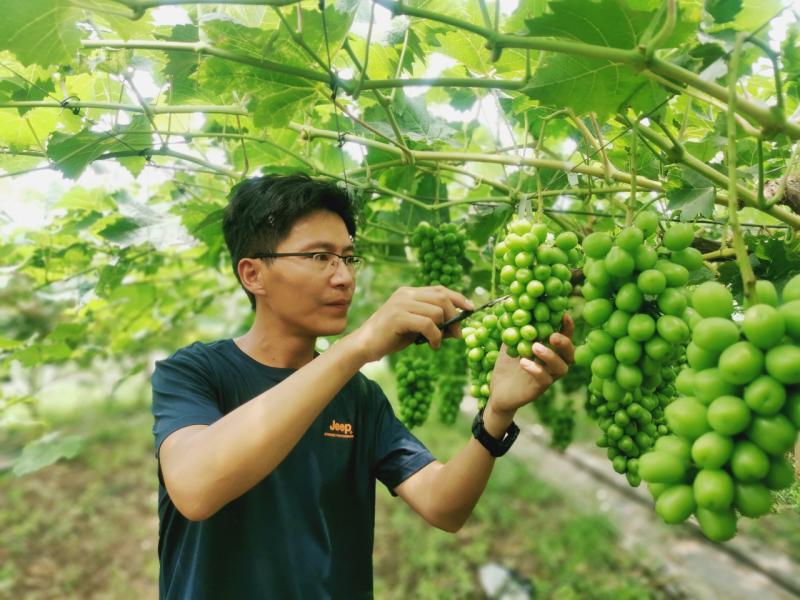 今年35歲的楊建看起來和普通的農(nóng)民沒啥兩樣,常年的勞動使得他皮膚黝黑,飽經(jīng)滄桑的雙手磨出了厚厚的繭子,看不出他是一個擁有研究生學(xué)歷的讀書人。500多度的近視鏡和談及葡萄時那種滔滔不絕侃侃而談的話語,“營養(yǎng)生長抑制”、“頂端優(yōu)勢”等一個個專業(yè)名詞和盤托出讓人感覺他又與普通農(nóng)民有點不一樣。楊建一邊介紹著,一邊摘下一串陽光玫瑰葡萄讓筆者品嘗,葡萄水多、甘甜,帶著濃濃的玫瑰花香,沁人心脾。