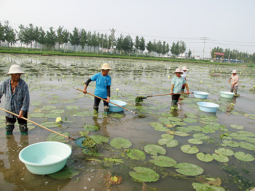 8月30日,在徐州市銅山區(qū)茅村鎮(zhèn)富麗蓮花種植基地,幾名工人在蓮花池里打撈水草和浮萍。該基地去年投資300多萬元,從福建引種九品香水蓮試種成功。蓮花不僅香、美,且一身都是寶,除觀賞外,還可食用、藥用、美容、保健;貙ι徎ㄔ灾惨蠛芨,采用無公害化栽植、管理。畝效益可達20萬元。