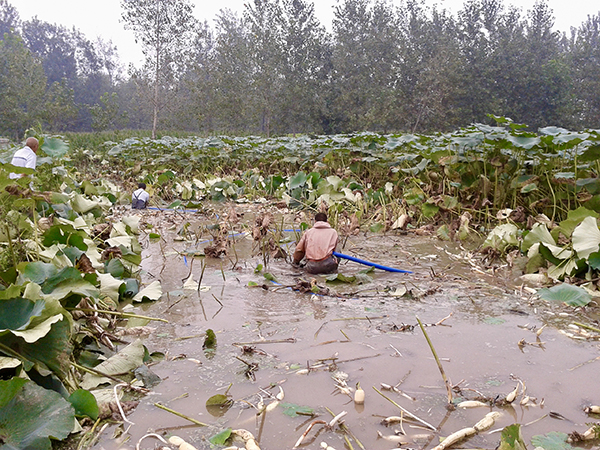 “從農(nóng)村來(lái),回農(nóng)村去!”2010年,基于對(duì)農(nóng)村的特殊感情,我便攜數(shù)年積蓄回到老家開(kāi)始創(chuàng)業(yè)。我從小生活在農(nóng)村、長(zhǎng)在農(nóng)村,所以對(duì)農(nóng)村一直懷有一種熾熱的鄉(xiāng)土情懷,返璞才能歸真,我不光要干起來(lái),更要帶著村民一起富起來(lái)。當(dāng)時(shí)的周莊村農(nóng)用地約5300余畝,僅靠分散的傳統(tǒng)種植難以實(shí)現(xiàn)產(chǎn)業(yè)增收,憑借與揚(yáng)州農(nóng)學(xué)院多年的業(yè)務(wù)往來(lái)我了解到蓮藕種植潛力巨大,且精品藕種的銷售市場(chǎng)廣闊,于是我決定做村里第一個(gè)“吃螃蟹”的人,朝著水產(chǎn)養(yǎng)殖方向試一試。