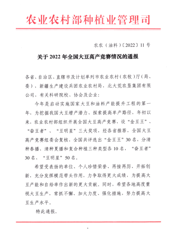 據(jù)了解,為挖掘我國大豆增產(chǎn)潛力,探索提高單產(chǎn)路徑,2022年,農(nóng)業(yè)農(nóng)村部組織開展全國大豆高產(chǎn)競賽。經(jīng)各省推薦,全國大豆高產(chǎn)競賽組委會復核,全國共評選出“金豆王”30名,分清種春播、清種夏播和復合種植三種類型各10名 。