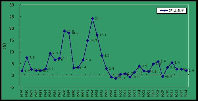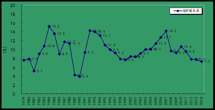 改革開放以來(lái)中國(guó)經(jīng)濟(jì)增長(zhǎng)走勢(shì)表現(xiàn)為三輪周期:1981年至1990年為第一輪周期,1990年至1999年為第二輪周期,1999年至現(xiàn)在為第三輪周期。第一輪經(jīng)濟(jì)周期的下行期為1985年至1990年,經(jīng)濟(jì)增速?gòu)?984年的峰值15.2%回落到1990年的谷值3.9%。第二輪經(jīng)濟(jì)周期的下行期為1993年至1999年,經(jīng)濟(jì)增速?gòu)?992年的峰值14.3%回落到1999年的谷值7.6%。第三輪經(jīng)濟(jì)周期的下行期為2008年至現(xiàn)在,經(jīng)濟(jì)增速?gòu)?007年的峰值14.2%回落到2014年的7.3%,從目前的經(jīng)濟(jì)增長(zhǎng)速度變化看,這輪周期還沒(méi)有結(jié)束。