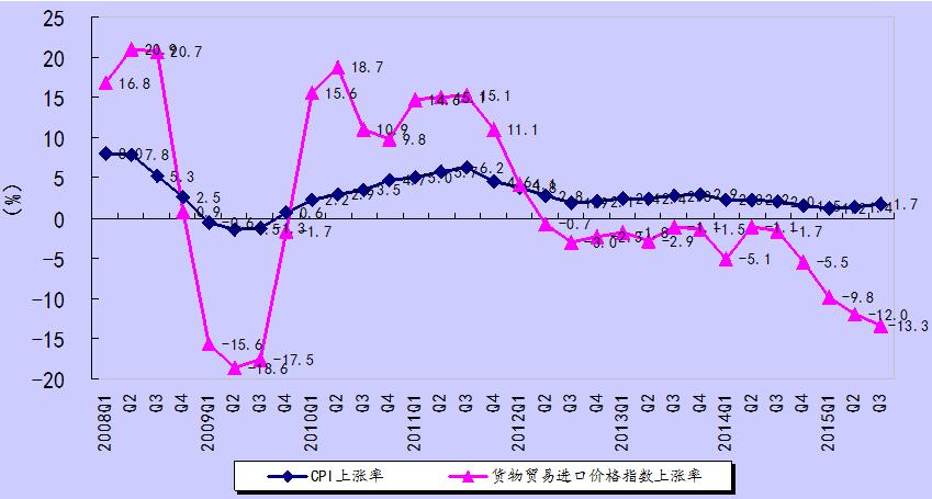 今年前三季度,貨物進(jìn)口價(jià)格同比下降11.6%。其中,一、二、三季度分別下降9.8%、12.0%和13.3%,降幅逐季擴(kuò)大。從2012年二季度開始,貨物進(jìn)口價(jià)格進(jìn)入下降區(qū)間,到今年三季度,持續(xù)下降了14個(gè)季度(見圖10)。貨物進(jìn)口價(jià)格持續(xù)下降一是受國(guó)際大宗商品價(jià)格持續(xù)下降的影響,二是受國(guó)內(nèi)市場(chǎng)需求不足的影響。