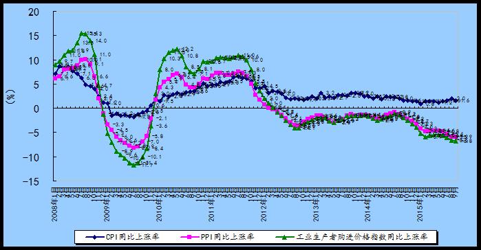 今年前三季度,工業(yè)生產(chǎn)者出廠價(jià)格同比下降5.0%,工業(yè)生產(chǎn)者購(gòu)進(jìn)價(jià)格下降5.9%。其中,一、二、三季度,工業(yè)生產(chǎn)者出廠價(jià)格分別下降4.6%、4.7%和5.7%,降幅逐季擴(kuò)大;工業(yè)生產(chǎn)者購(gòu)進(jìn)價(jià)格分別下降5.6%、5.5% 和6.5%,三季度降幅擴(kuò)大。工業(yè)生產(chǎn)者出廠價(jià)格從2012年3月份開始下降,到今年9月份,持續(xù)回落了43個(gè)月;工業(yè)生產(chǎn)者購(gòu)進(jìn)價(jià)格從2012年4月份開始下降,到今年9月份,持續(xù)回落了42個(gè)月(見圖9)。工業(yè)生產(chǎn)者價(jià)格持續(xù)下降一是受工業(yè)產(chǎn)品需求不足、產(chǎn)能過(guò)剩的影響,二是受國(guó)際大宗商品價(jià)格持續(xù)下降的影響。
