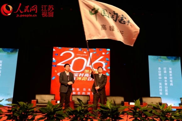 沭陽縣長(zhǎng)卞建軍(右一)接過“中國(guó)淘寶村高峰論壇”旗幟