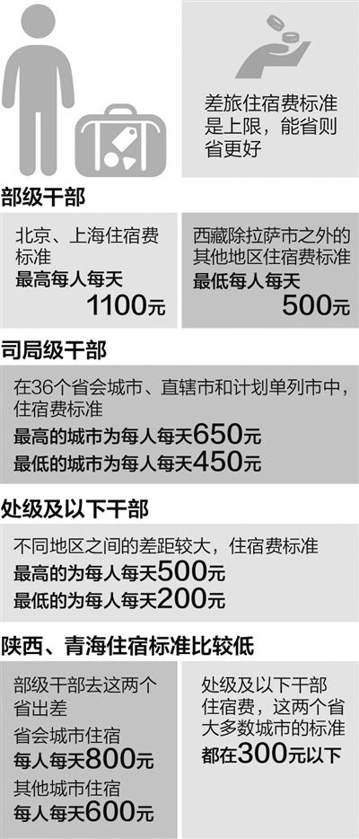 從公布的差旅住宿費(fèi)標(biāo)準(zhǔn)明細(xì)表來看,部級干部出差到北京、上海的住宿費(fèi)標(biāo)準(zhǔn)最高,為每人每天1100元;部級干部住宿費(fèi)標(biāo)準(zhǔn)最低的,是西藏除拉薩市之外的其他地區(qū),每人每天500元。在36個(gè)省會城市、直轄市和計(jì)劃單列市中,司局級干部住宿費(fèi)標(biāo)準(zhǔn)最高的城市為每人每天650元,最低的城市為每人每天450元。處級及以下干部住宿費(fèi)標(biāo)準(zhǔn),不同地區(qū)之間的差距較大,標(biāo)準(zhǔn)最高的是500元,最低為200元。